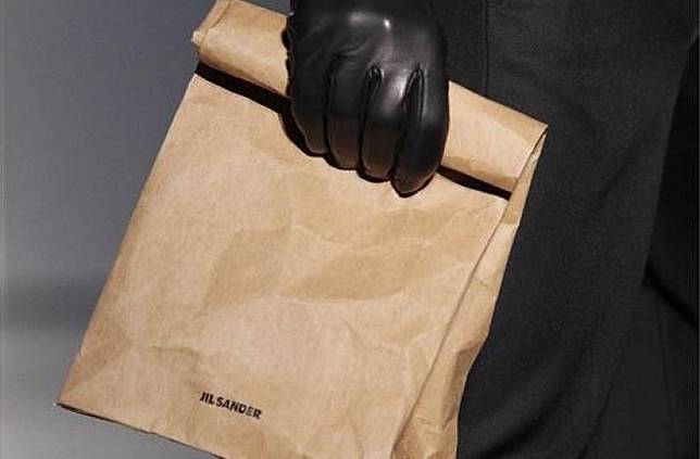 Tas yang 100 persen berbahan kertas coklat berlapis dan dijahit di sisi kanan kiri dan bawah ini mirip sekali dengan kertas pembungkus makanan dari restoran cepat saji. Hanya saja, ada cetak logo Jil Sander di bagian bawahnya. Wah jangan sampai tertukar ya.